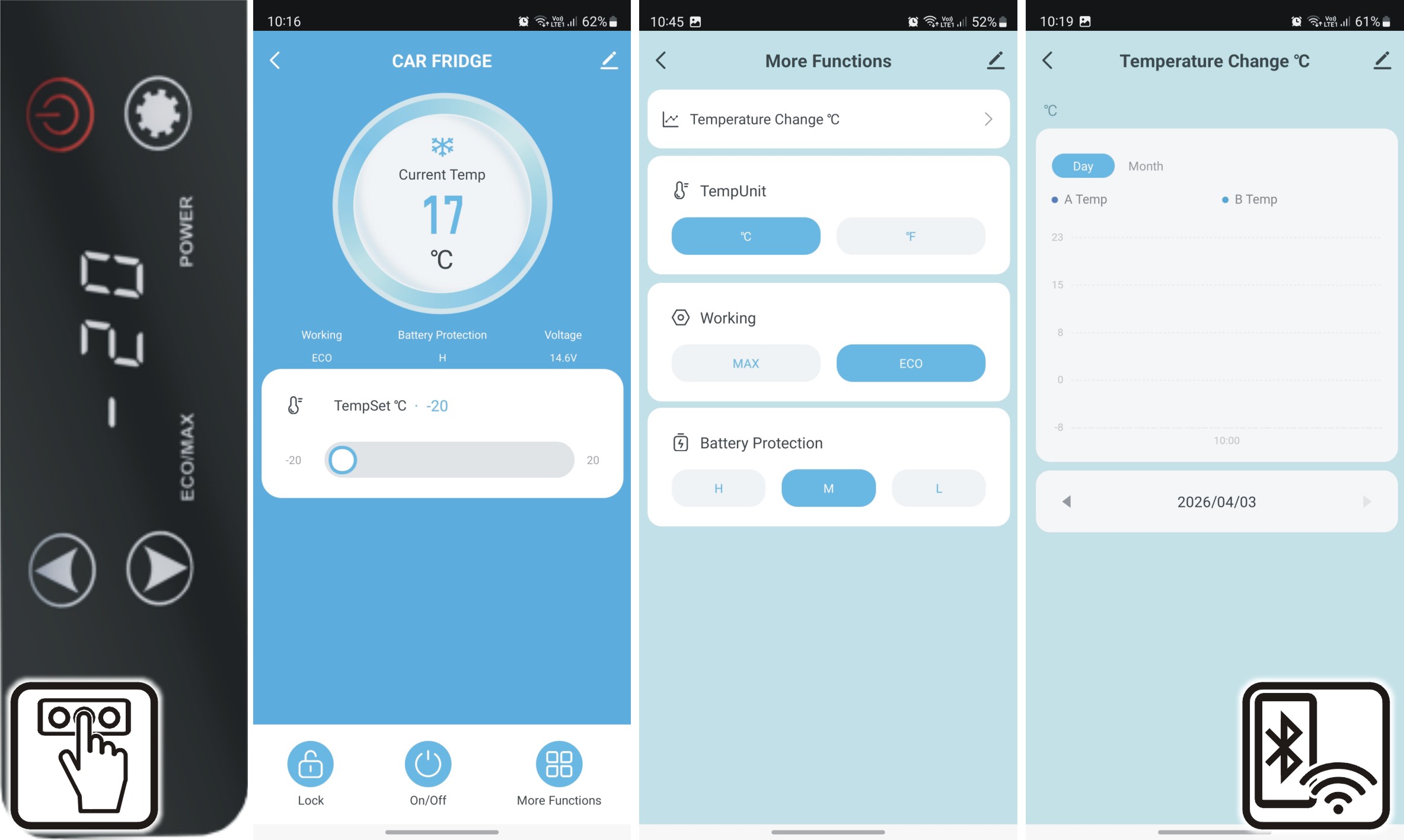 - tryb ECO / MAX | poziom ochrony akumulatora L / M / H | blokada panelu dotykowego Wł / Wył