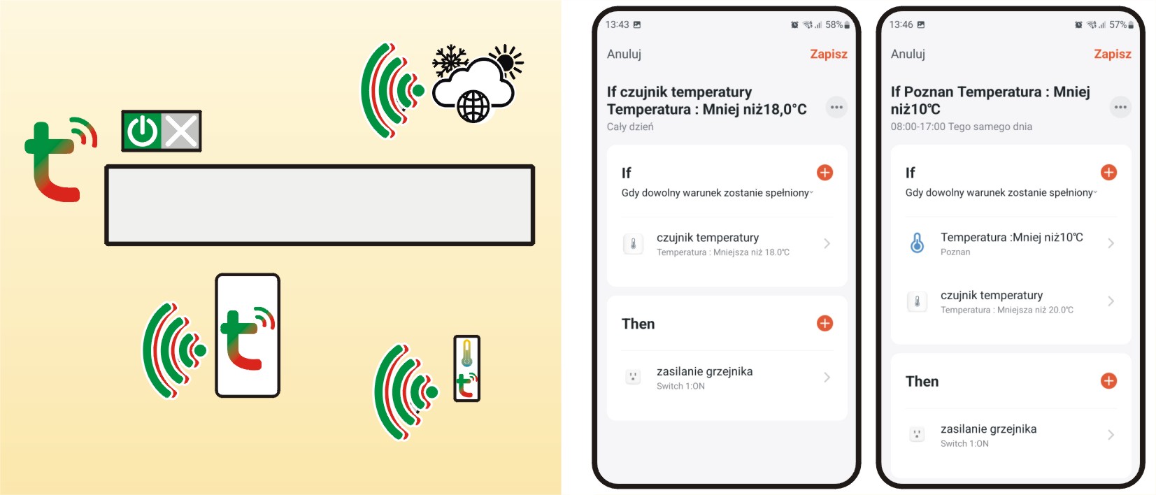 - jeśli: jest dzień roboczy | w godzinach 22 – 6 | temperatura zewnętrzna < 10°C | wilgotność pomieszczenia > 80%