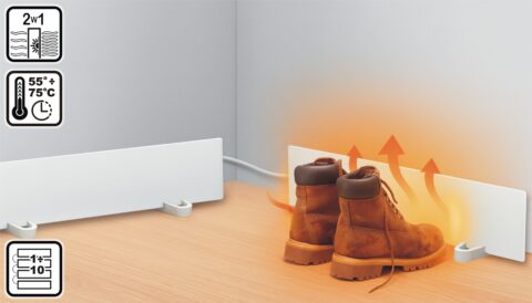 - jako kompaktowy grzejnik znakomicie sprawdza się również w celowanym dogrzewaniu na niewielkich odległościach (np przestrzeń podbiurkowa) czy równomiernym, niegwałtownym suszeniu obuwia …