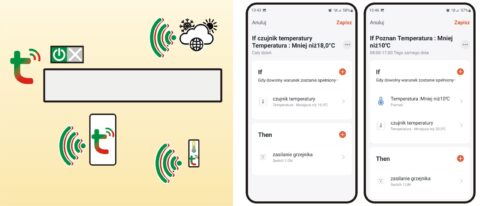 - możliwość programowania ustawień i scenariuszy załączania i wyłączania ogrzewania w oparciu o sygnał informacyjny z odrębnego czujnika temperatury i wilgotności WiFi – Tuya (dostępny oddzielnie)