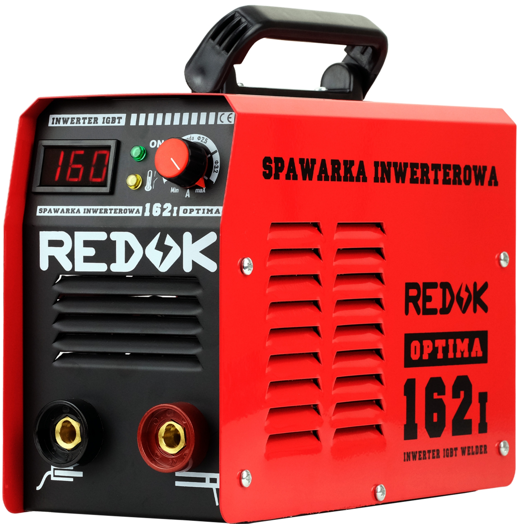 Spawarka inwertorowa Redok Optima 162i wyposażona jest w manualny włącznik znajdujący się z tyłu urządzenia, wentylator chłodzący, zabezpieczenie termiczne oraz z przodu urządzenia pokrętło do płynnej regulacji prądu spawania.